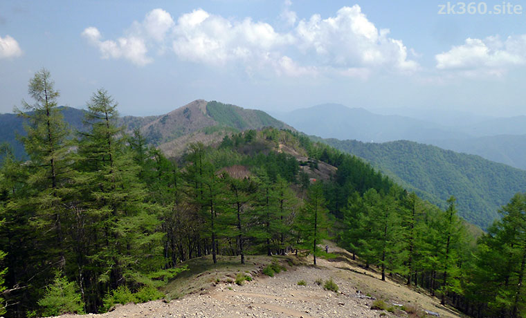 写真1:七ツ石山と雲取山の中間、ヨモギノ頭への登りから遠望した七ツ石山。なかなか形がいい。稜線に石尾根が見える。(撮影:2017/5/23)