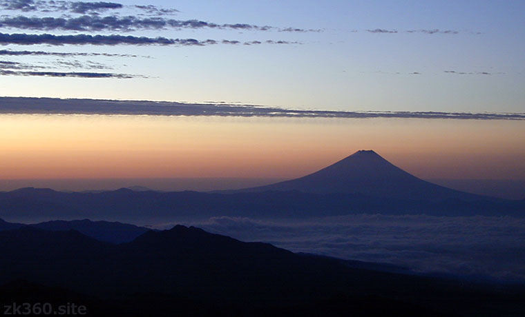 北アルプス・水晶小屋付近から富士山を遠望。直線距離で約154km。北アルプスからは八ヶ岳と南アルプスの間に富士山が見える