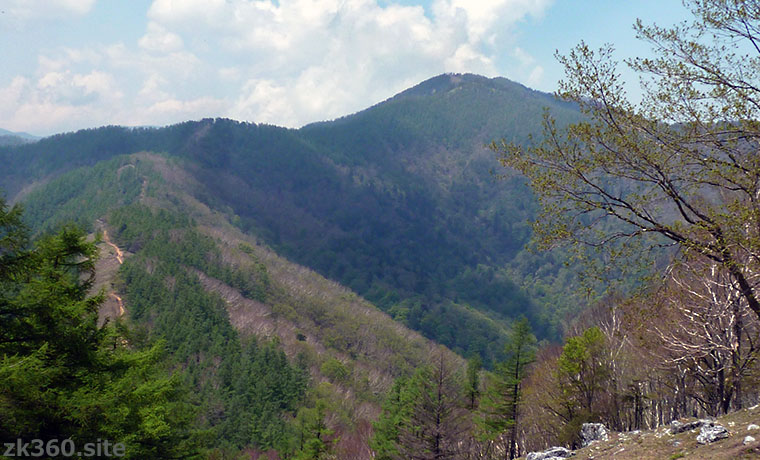 写真1:奥多摩の七ツ石山から見た雲取山。その山頂のすぐ下、もうひとつ三角形の山形に見えるのが小雲取山です。(撮影:2017/5/23)