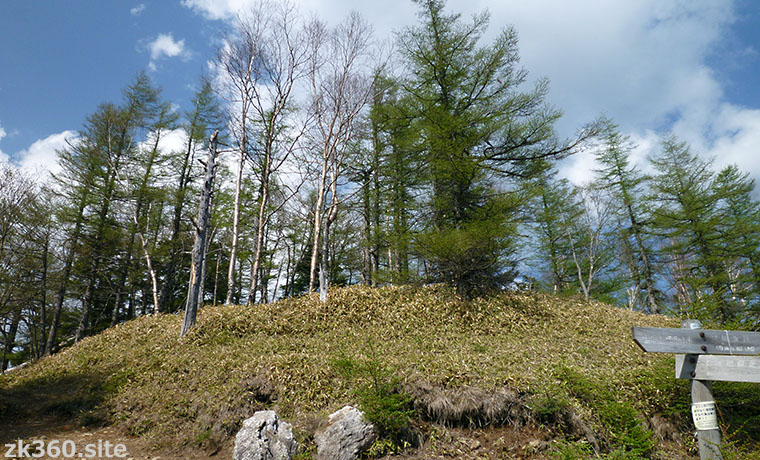 目印は小さな手作りの標識だけ、標高は1936mです。私が行ったとき(2017年5月)は、山頂の一角に小さな標識がぶら下げられていました。