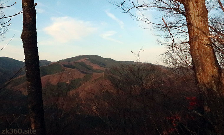 陣馬山タイトル写真3写真3:山梨との県境に近い鷹取山の山頂から見た夕方の陣馬山。西側から見ると、たおやかな丸みを帯びた山容になる。(2021/3/24)