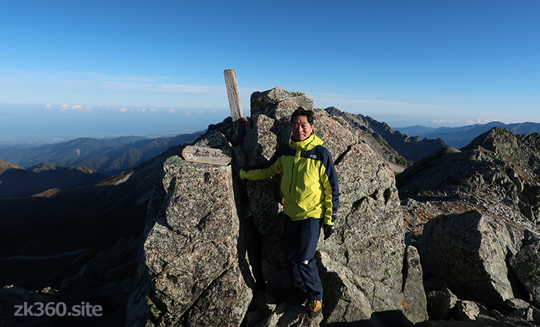 写真1:立山の最高地点、大汝山(おおなんじやま)にて。立山の主峰は雄山(おやま)ですが、標高はこちらの方が12m高い。(撮影:2018/10/03)