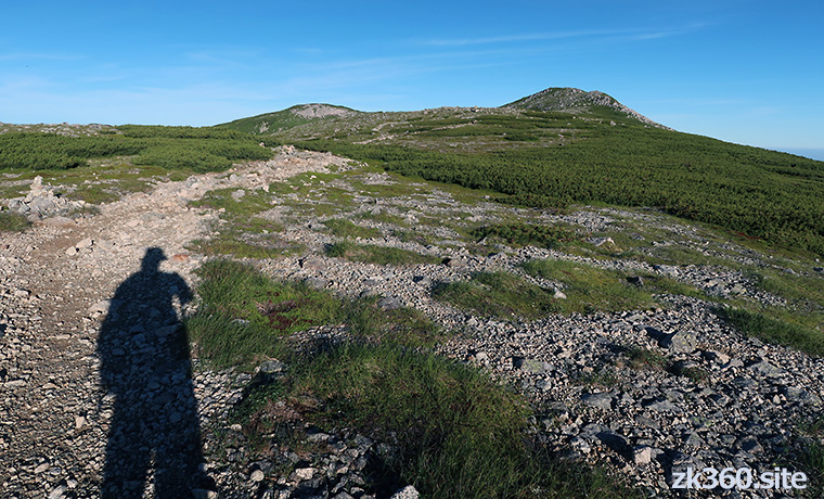 写真3:北アルプス・双六岳(すごろくだけ)の双六台地にて。ここで振り向くと、槍ヶ岳がドーンと真正面に見えます。(撮影:2019/8/6)