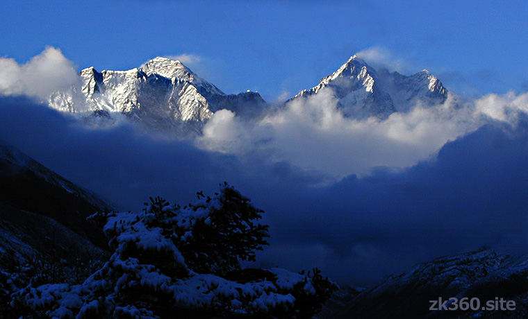 写真1:ネパール・タンボチェの丘から望む、夕照のエベレスト(左)とローツェ(右)。(撮影:2001/4/18)