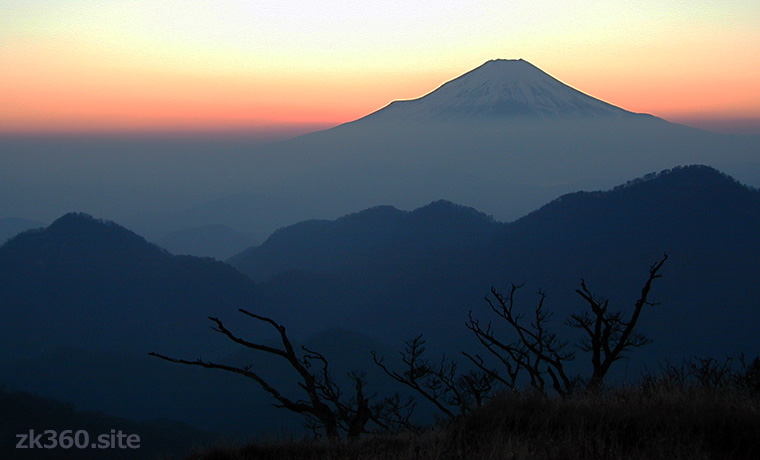 写真2:丹沢の最高峰・蛭ヶ岳(ひるがたけ)の山頂から見た、夕焼け空に浮かぶ富士山のシルエット。(撮影:2001/11/23)