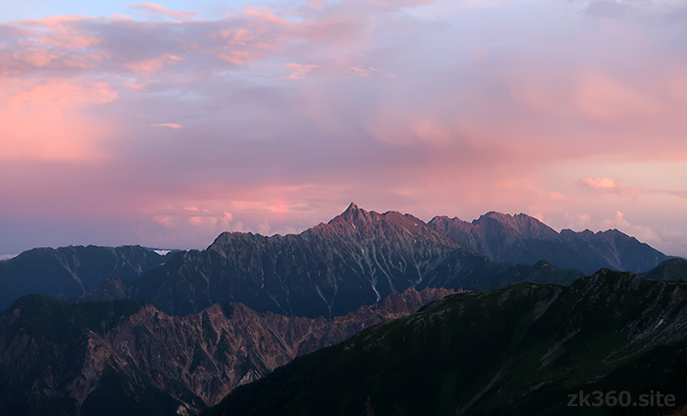 写真4:水晶小屋の南側の高台から望む、夕刻の槍ヶ岳。左に伸びるのが北鎌尾根、右奥は穂高連峰(撮影:2019/8/7)