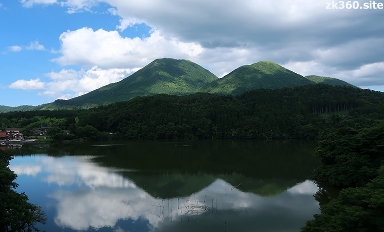三瓶山タイトル写真1写真1:西側の浮布池から見た三瓶山。左側の大きな山が男三瓶山で、その右が子三瓶山。右奥に見えるのは孫三瓶山の一部。(撮影:2022/6/29)