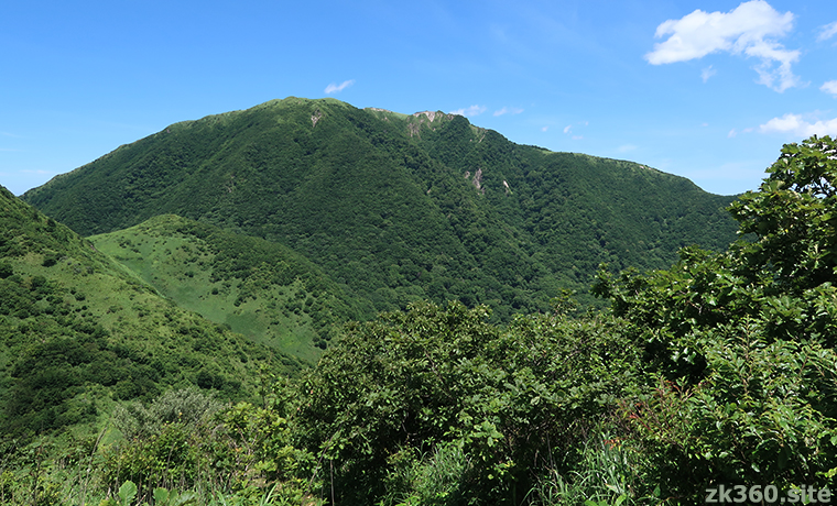 三瓶山タイトル写真4写真4:男三瓶山と女三瓶山の間にある兜山(かぶとやま)付近から見た子三瓶山。右下の小ピークは赤雁山(あかがりやま)。(撮影:2022/6/29)