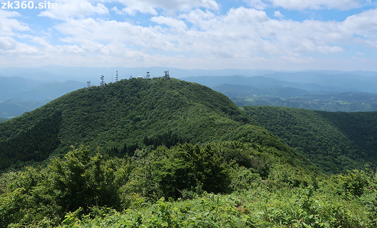 三瓶山タイトル写真6写真6:孫三瓶山の中腹から室の内越しに見た女三瓶山(電波塔があるピーク)。右に下がって少し上がったところが大平山。(撮影:2022/6/29)