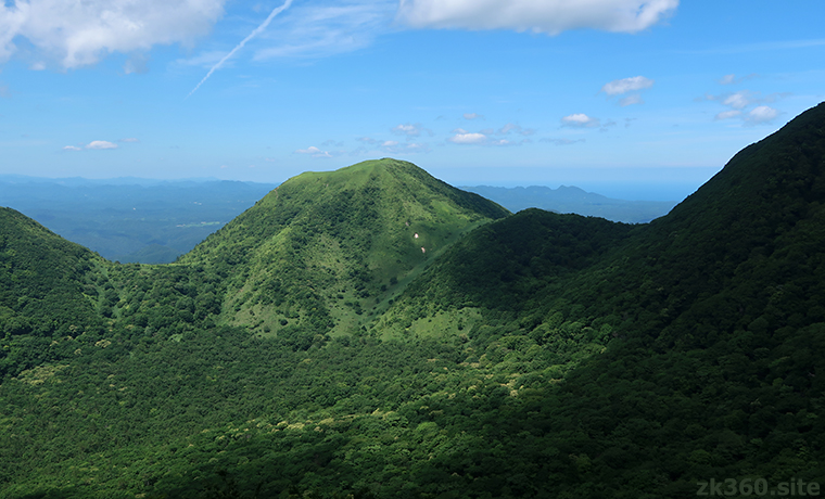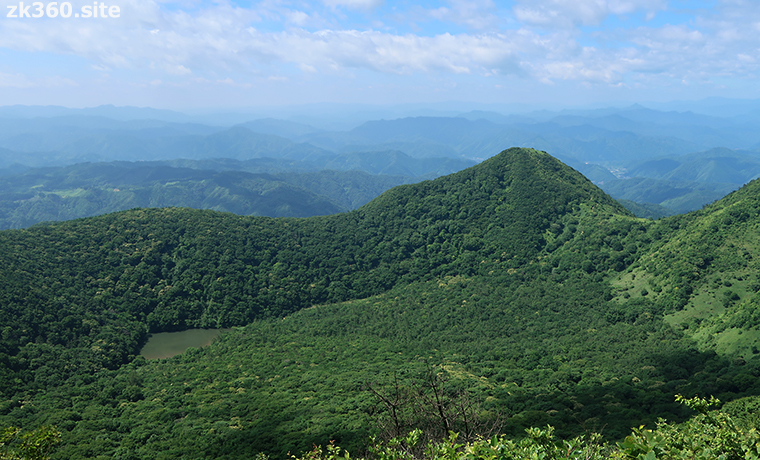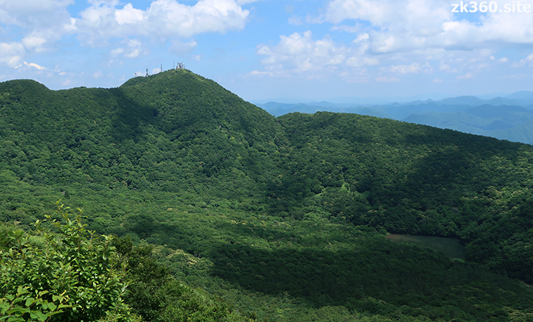 三瓶山タイトル写真5写真5:同じく兜山あたりから室の内(噴火口)越しに見た孫三瓶山。この稜線を歩いて三瓶山を一周できる。左下は室内池。(撮影:2022/6/29)