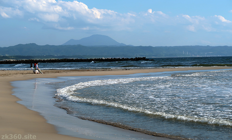 三瓶山タイトル写真7写真7:国引き神話*で綱だったとされる長浜海岸(薗の長浜)から遠望した三瓶山。主峰・男三瓶山の山容がよくわかる。(撮影:2022/6/30)