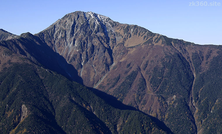 北岳タイトル写真1写真1:鳳凰三山から野呂川を挟んで見た北岳。正面に見える崖はバットレスと呼ばれ、岩登りの聖地のひとつ。(撮影:2003/10/24)