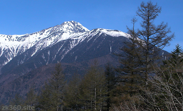 北岳タイトル写真2写真2:夜叉神峠から見た春の北岳(奥のピーク)。手前は池山吊尾根で、かつては北岳に至るメインルートでした。(撮影:2002/4/29)