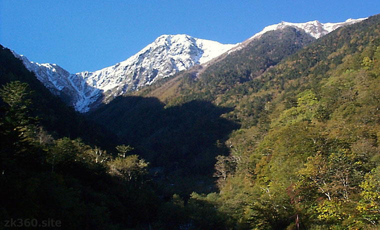 北岳タイトル写真4写真4:大樺沢から見上げた北岳、これも定番の景色。この日は、初雪をかぶって北岳が白く輝いていました。(撮影:1999/10/21)
