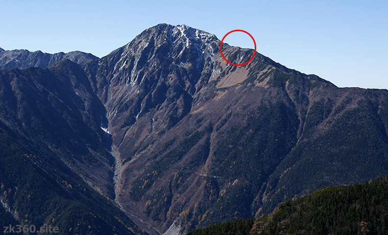 北岳ノ肩タイトル写真1写真1:鳳凰三山から見た北岳。赤丸の部分が北岳ノ肩で、ここは日本有数の絶景スポットのひとつだと思います。(撮影:2003/10/24)