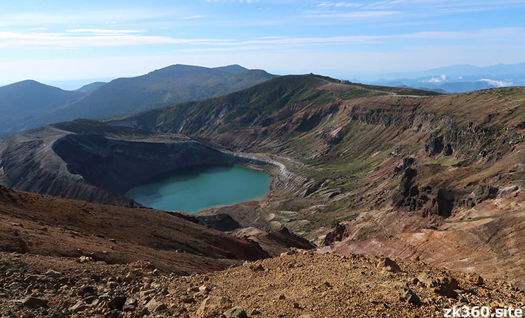 御釜と刈田岳がおりなす景色も美しいですが、背面の丘にも注目してほしいところ。火山の噴火口の中にいることを実感します。稜線に見える建物は熊野岳避難小屋です。