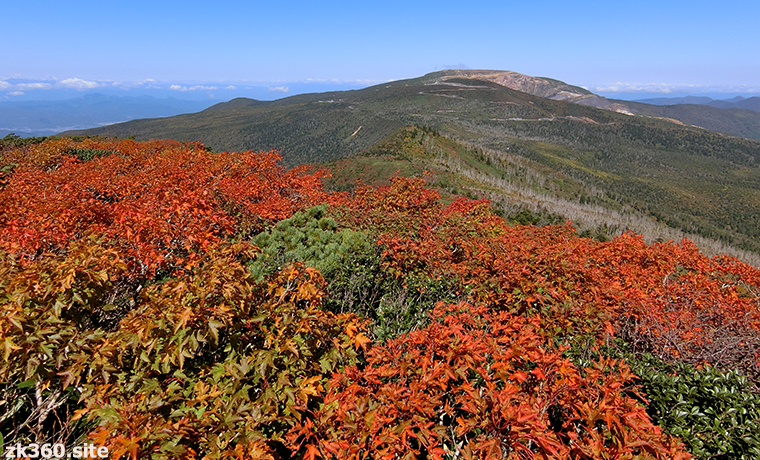 最後に、最高地点の熊野岳山頂で撮った360°全天球パノラマ写真です。広い山頂部に熊野神社があります。山頂に来ると御釜は見えませんが、代わりに西側の山並を遠望することができます。